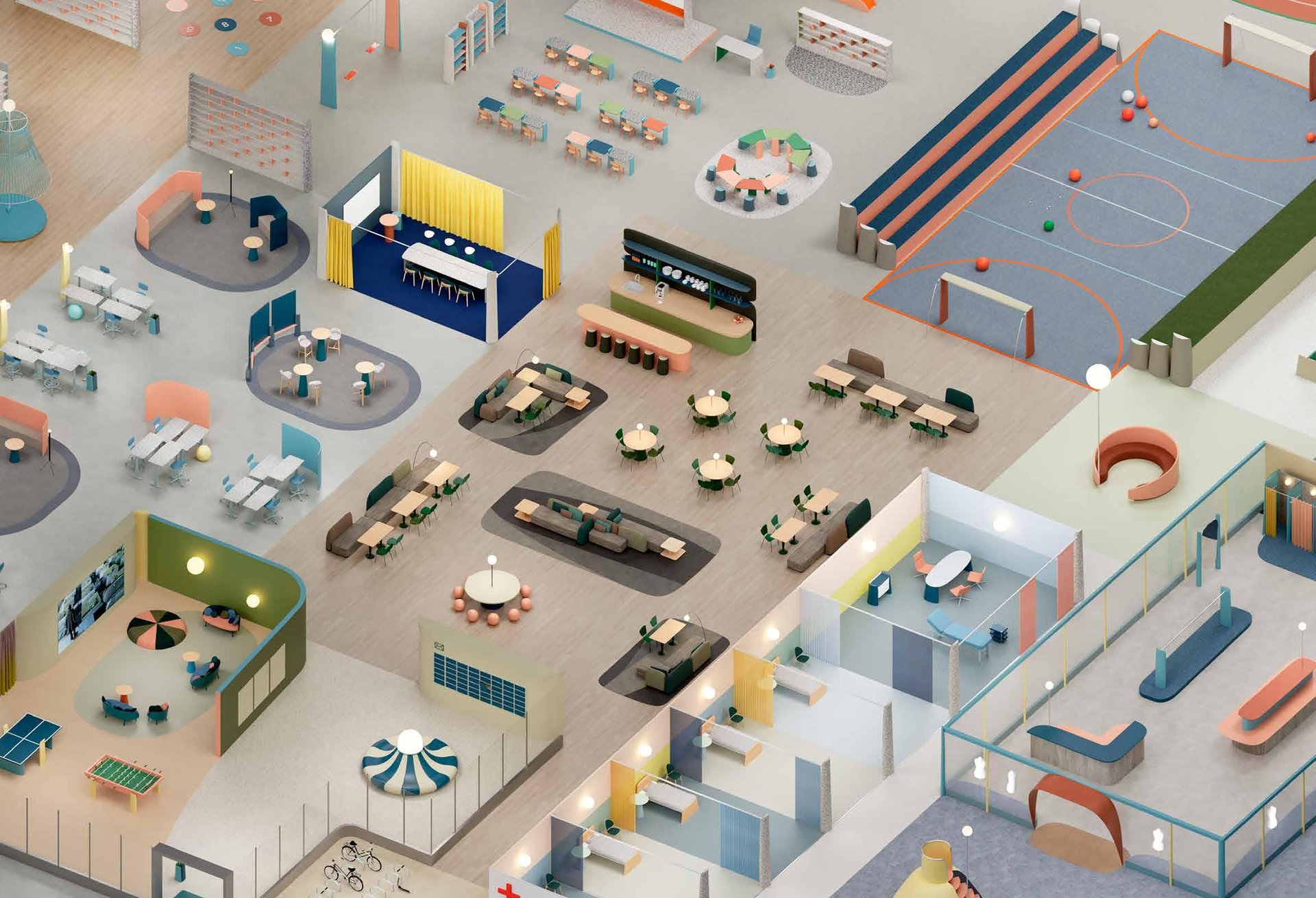 The office as a playground Open plan and collaborative Create an atmosphere Dynamic Welcoming and comfortable Sustainable and stunning To foster health and happiness Through soft sounds Better air quality And defined spaces Encourage interaction And team spirit Together and alone Let’s go back